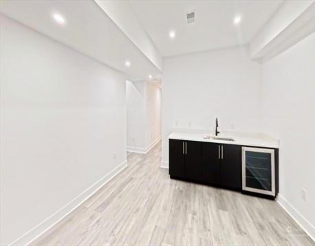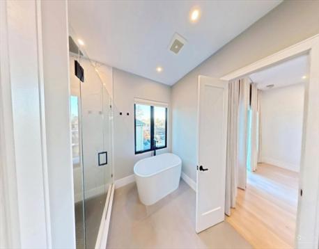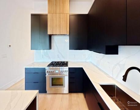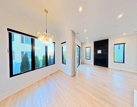 Stunning contemporary 4-level home in Newton featuring an open main level with a dining area and a beautiful family room with a custom fireplace. The modern kitchen offers top-of-the-line appliances, quartz countertops, custom cabinetry, and a large island with seating for four. Sliding doors open to a private patio and fenced-in yard. The 2nd floor offers three bedrooms, including a spacious primary suite with a custom walk-in closet and and a luxurious spa-like en-suite bathroom, and its own private balcony. The 3rd floor features an outdoor deck with sunset views. The finished basement includes a wet bar and an additional bedroom. Large windows with $50K in custom blinds bring in abundant light. Additional highlights include a garage plus outdoor parking for four cars, all in a prime location next to a park and Whole Foods Market. No Condo Fee !!!