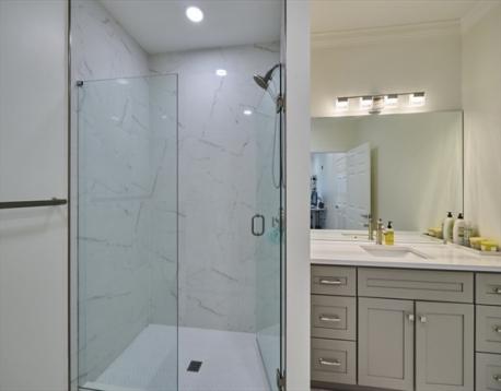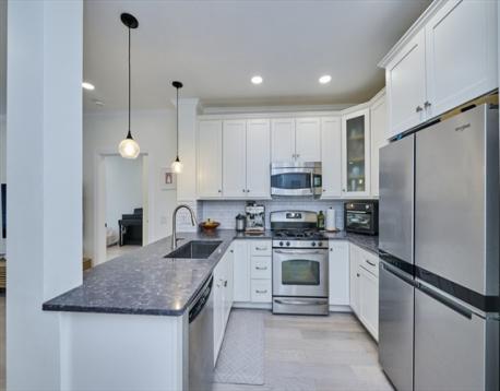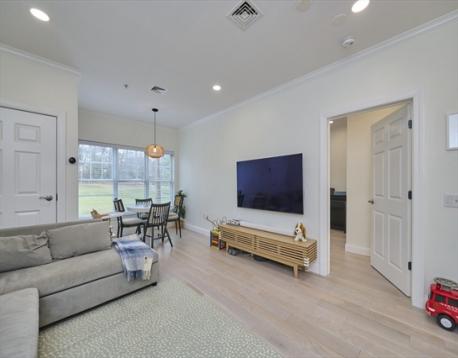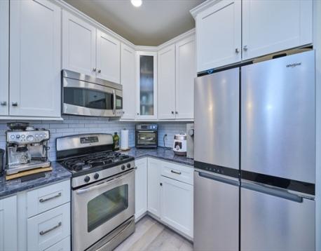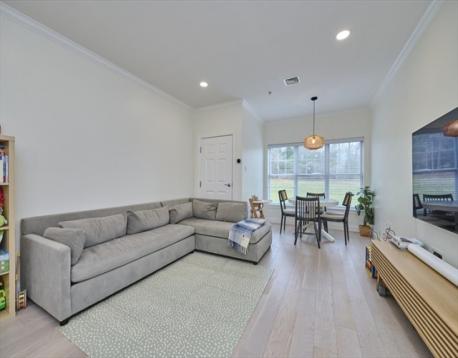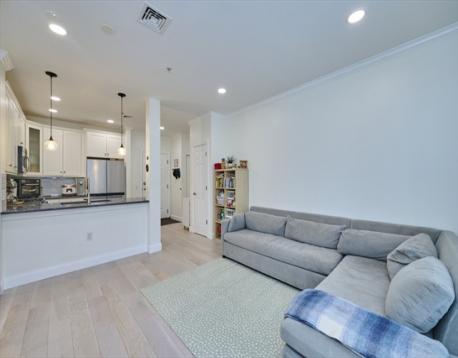 Step into this stunning, completely renovated contemporary condo that perfectly blends designer style with serene golf course views. This is not your typical cookie-cutter unit; every inch has been transformed within the last five years. The open floorplan features engineered hardwood floors throughout, a modern kitchen with shaker cabinets, quartz countertops, subway tile backsplash, and gas cooking. Both full baths are true retreats, boasting dove-grey cabinetry, white quartz counters, and a primary suite with a custom walk-in rain shower, frameless glass, and marble-patterned tile. Open floorplan with breakfast nook overlooking the golf course. Additional features include in-unit laundry, central heat/AC, extra storage, and two parking spaces, including one garage spot. This pet-friendly building also offers a fitness room and a common roof deck. Located just steps from the MBTA, this home offers the perfect balance of city access and quiet luxury. Schedule your private tour today!