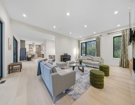 Experience a luxurious contemporary new construction home built in 2023 by a prominent local developer, ideally located on a serene cul-de-sac. Boasting 5 bedrooms, 5 full baths, and 2 half baths, it features state-of-the-art amenities and exquisite finishes throughout. The main level features an open-concept design, complete with a spacious living room and fireplace, a dining area, and a Thermador-equipped kitchen that seamlessly transitions to a large patio, ideal for effortless entertaining. The second level offers four private en-suite bedrooms and a convenient laundry room. A versatile open area awaits on the third floor, while the lower level with a walk-out door provides a family room with a wet bar including a wine fridge and an additional en-suite bedroom and half-bath, and another set of laundry - perfect for guests. Enjoy modern conveniences, including a heated 2-car garage with an epoxy floor, sprinkler system, and a fenced-in yard. Please use G Roadway in the GPS.