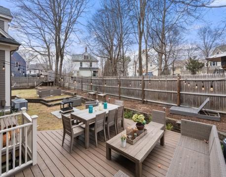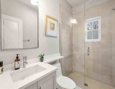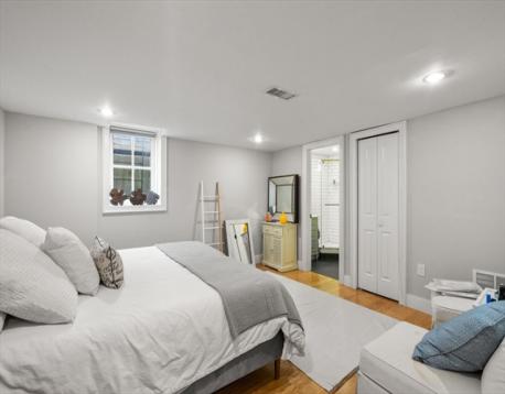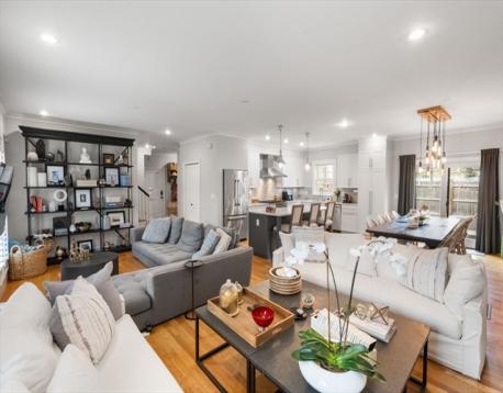 WOW! One of the largest and most unique townhomes on the market! Tucked away on a quiet cul-de-sac, this home lives like a single-family with modern luxury throughout. The open-concept main level features a stunning kitchen with large island and high-end appliances flowing into spacious dining and living areas with direct access to a large private yard. Office, full bath, and direct entry 2-car garage complete this level. The second floor offers a primary suite with walk-in closet and spa-like bath, plus two bedrooms, full bath, and laundry. Third floor suite with living area, bedroom, and full bath. Finished lower level with large living space, 5th bedroom, and full bath. Walk to Peirce School, parks, Express bus, commuter rail, shops, and restaurants with easy access to the Pike and Route 95. This is truly one of the best and a must see!