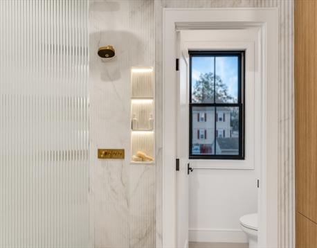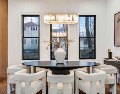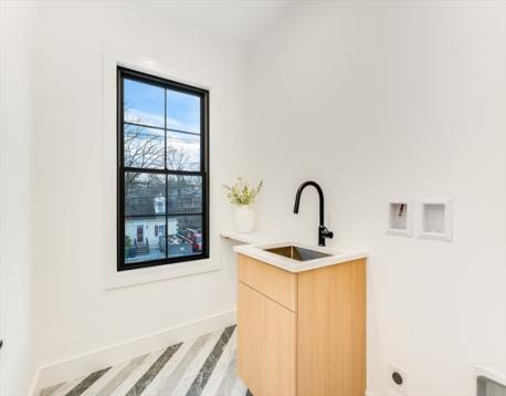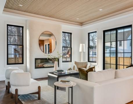 Stunning new construction Modern Tudor in Newton South offering 6 bedrooms, 5.5 baths, and a 2-car garage. This thoughtfully designed home blends timeless character with elevated luxury finishes throughout. The walnut kitchen anchors the open-concept layout and features a premium Thermador appliance package, while herringbone floors flow seamlessly across the main living spaces. The living room is highlighted by a striking curved fireplace and dramatic tray ceiling, creating a warm yet sophisticated focal point. A custom mudroom provides everyday function, complemented by a stylish powder room and exceptional attention to detail. Custom built-ins are beautifully integrated across multiple spaces. Upstairs, the primary suite is a true retreat with a curved tray ceiling, oak-paneled walls, and a spa-like bath with soaking tub and curbless shower. Ideally located near Newton Centre, Route 9 dining/shopping, and easy access to I-95.