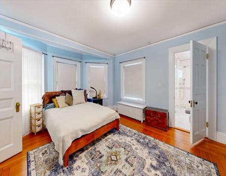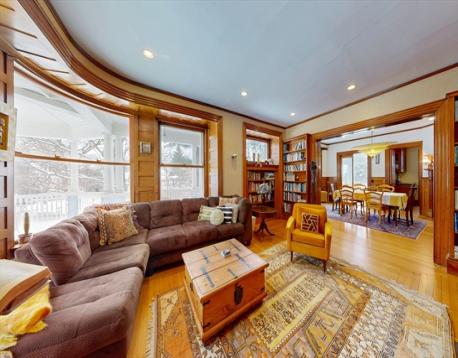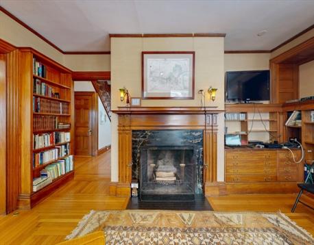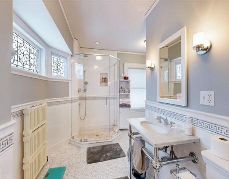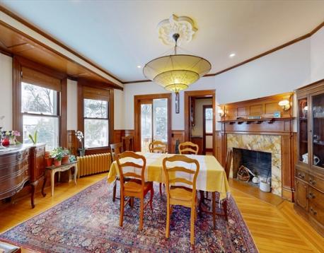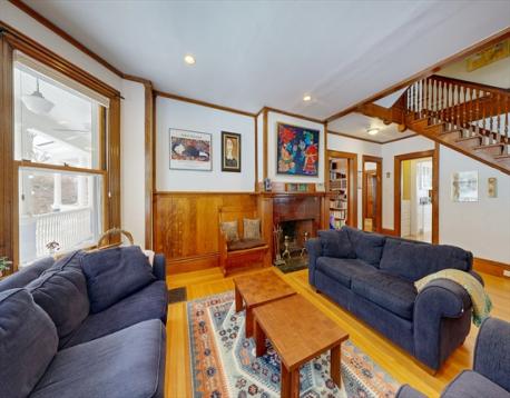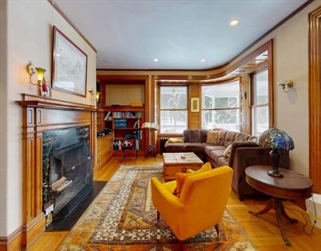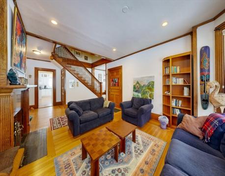 This beautifully updated 1894 Victorian home sits proudly upon a knoll in the heart of Newton Centre, boasting a commanding street presence and a stunning wrap-around porch. Inside, the residence seamlessly blends historic charm—original moldings, exquisite quarter-sawn oak, and leaded glass—with modern renovations and updated mechanical systems. The gracious foyer opens into a home bathed in natural light, featuring 10-foot ceilings and hardwood floors. Highlights include a 23-foot living room with a fireplace, a family room with pocket doors, and a serene greenhouse sunroom. The updated eat-in kitchen offers a center island and granite counters, complemented by an elegant dining room and a butler’s pantry with a wine cooler. The second floor hosts a luxurious master suite with a marble radiant-heat bath, two additional bedrooms, and laundry. The third floor adds three more bedrooms and a full bath. Outside, enjoy a lovely yard and a 2-car garage, all steps from Newton Center.