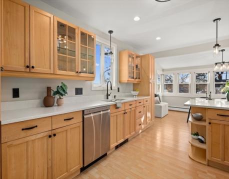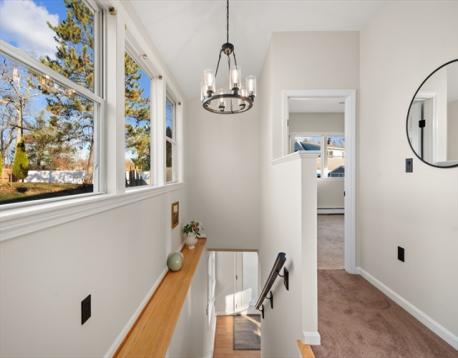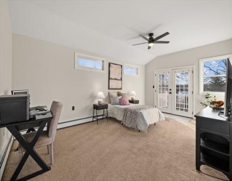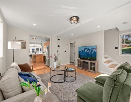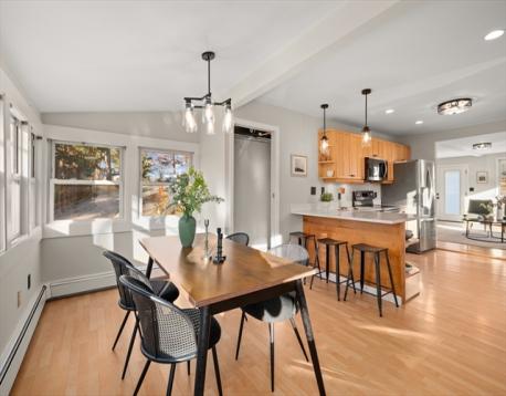 Beautifully updated & filled with natural light, this spacious home offers stunning views of Martins Pond & exceptional indoor/outdoor living. The newly renovated kitchen features quartz countertops, stainless steel appliances, modern lighting & opens to a sun-filled dining room wrapped in windows overlooking the water. The expansive living room includes french doors leading to a large patio perfect for grilling & entertaining. Two very spacious bedrooms include a primary with a walk in closet & a second bedroom with french doors to a new composite deck with spectacular pond views. The exquisitely remodeled 2nd floor bath offers radiant heat floors & a luxurious enclosed shower. A two-tiered yard and additional driveway on Cogswell Rd provides great flexibility & opportunity. Enjoy year round fun on Martins Pond boating, fishing, kayaking & ice skating. Freshly painted with updates throughout & a brand new septic system! Feels like a retreat but minutes to shops, restaurants & highway.