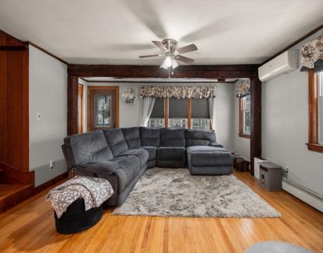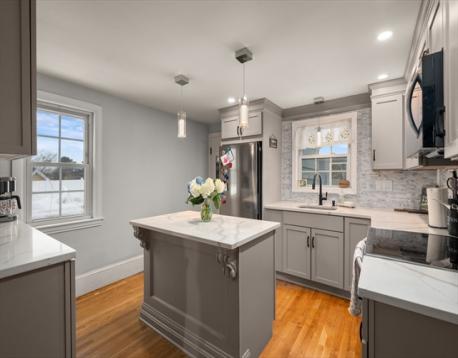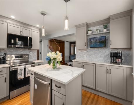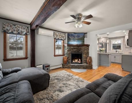 Wonderful 3-bedroom Cape in a great neighborhood of Gardner Park. Living room with a beautiful stone fireplace is open to the new kitchen with quartz counters & SS appliances. First floor den has a slider to an impressive new composite deck. Two generous bedrooms and a full bath on the second floor. Master bedroom has a slider to a balcony overlooking the yard and spiral staircase to deck. Potential for the third bedroom on first floor currently being used as dining room with new pellet stove., Finished unheated lower level has a spacious family room and an additional room. Converted to mini split systems for heat and air conditioning so baseboard is not connected. One car detached garage with slider to yard which is great for summer entertaining. Great value!!