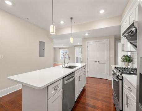 Brand new in 2019, this thoughtfully designed condo offers the perfect blend of style, space, and location! Stunning kitchen features a large island, gas cooking w high end, exterior-vented hood- ideal for the serious home chef- and opens to a huge 21x23 livingroom w space for ALL your living, dining & leisure needs. Primary suite includes a walk-in closet + en suite full bath. The 2nd bedroom is ideally located on the other side of the home along with the 2nd full bath offering a beautifully tiled walk-in shower with glass door. All closets have custom build-out, laundry-in-unit and high-velocity heating and cooling for year-round comfort. One garage parking spot accessed via rear door at 32 Gilson Rd. Set on a quiet street in the heart of Quincy Center, you're steps from Starbucks, Rozafah, and an easy stroll to Alba, Dotty's Kitchen, Fuji at Woc, Tokenfire and more! The Quincy Center Red Line stop is just 3/10 of a mile away — life and commuting from here couldn't be easier.
