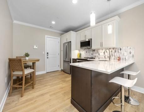NEW CONSTRUCTION – Be one of the first to view this beautifully designed 1 Bed / 1 Bath Condo at The Derrick Condominiums. Ideally located just three blocks from Quincy Adams MBTA and major highways (Route 3, I-93, I-95). This spacious unit features an open-concept layout with oversized windows and high ceilings, creating a bright and airy living space. The semi-custom eat-in kitchen includes GE Profile Series stainless steel appliances, two-tone cabinetry with pantry storage, marbled quartz countertops, and a breakfast bar.The large bedroom offers a walk-in closet with custom shelving. The bathroom is finished with luxurious tile and features a glass-enclosed shower with dual shower heads. In-unit laundry hookups, a deeded parking space, and the option to upgrade to a secure garage space complete the package. Others available.