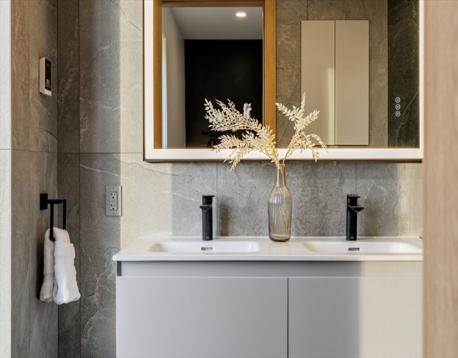A new standard of sophistication, defined by a unique vision and exceptional execution, Amber Residences has been designed to stand out. Plush landscaping surrounds the building. The brick exterior, enhanced with sound baffling insulation, boosts efficiency. Inside, a striking lobby of refined finishes and dramatic lighting sets the stage. Each residence features custom German-imported kitchens from SieMatic and LG stainless appliances. Living rooms extend seamlessly to private decks, while expansive Drutex windows bathe the space in sunlight. Bathrooms are fully tiled with floating vanities, concealed storage, and primary showers accented by large niches and linear lighting. Radiant floor heating in primary baths. Every detail—elevated doors, artful hardware and fixtures, wine cooler, whole-unit Wi-Fi—has been intentionally crafted. Smart entry uses facial and license-plate recognition. Amenities include basement storage, a dog-wash station, EV options, & two parking spaces included.