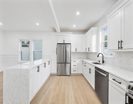 Rare gut renovated 2 family in the heart of Revere, offering luxury & income potential. With over 600 sqft of patio and outdoor deck space & a large backyard. This property is ideal for both owner occupants & investors. Unit 1 features 2 bedrooms, modern kitchen w/ quartz countertops, stainless steel appliances, custom closets & a stylish bath w/ Italian terrazzo tile. Spanning 3 levels, Unit 2 offers 3 bedrooms & 3 full baths, highlighted by an open kitchen w/ a quartz waterfall peninsula, elegant wainscoting & a primary bedroom w/ en suite bath. All bedrooms feature custom closets. Spa like baths include heated LED mirrors, travertine & terrazzo finishes. Recessed lighting & premium finishes throughout, new systems & separate utilities ensure efficiency & low maintenance living. Outside enjoy multiple decks, a paver patio, fenced yard & a new driveway w/ 2 off street parking. Steps to MBTA Bus 110 w/ access to Blue & Orange Lines, Broadway & Revere Beach!