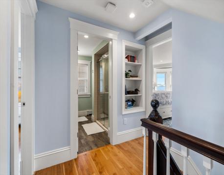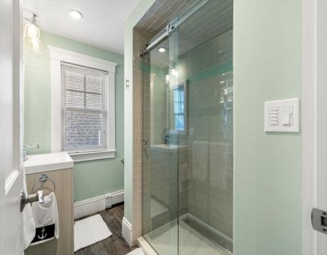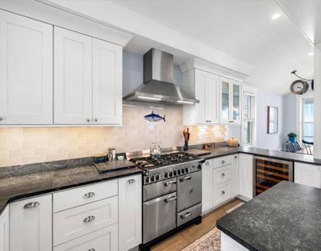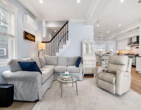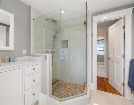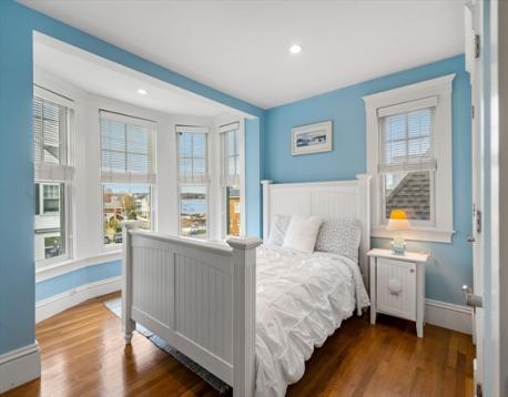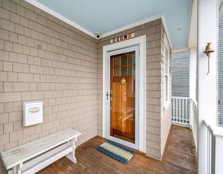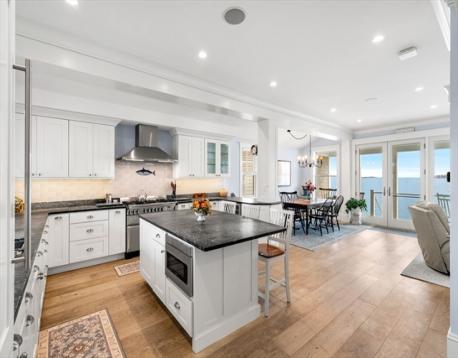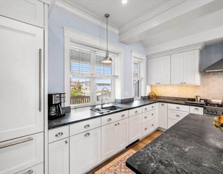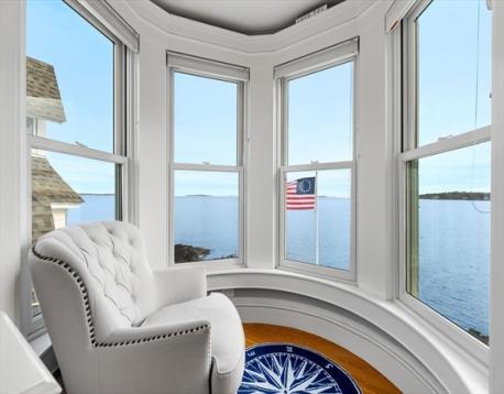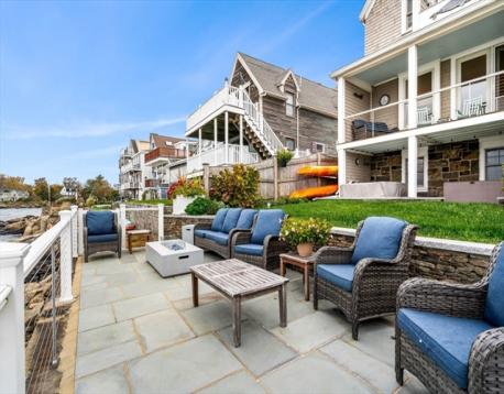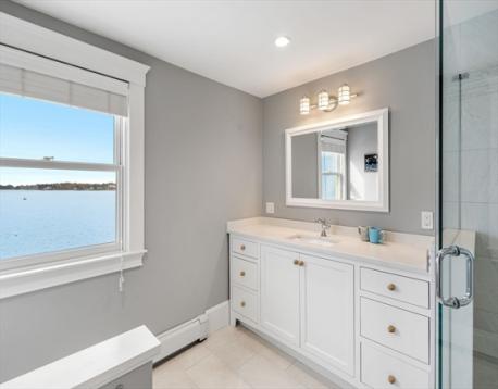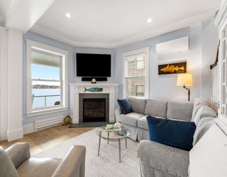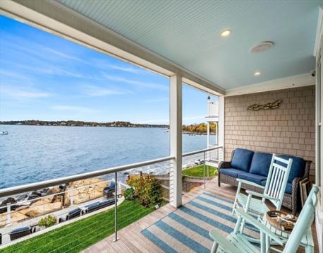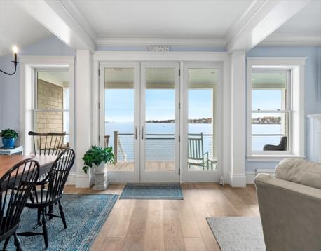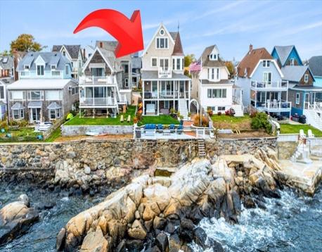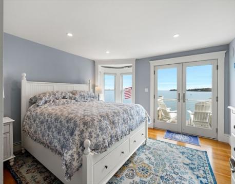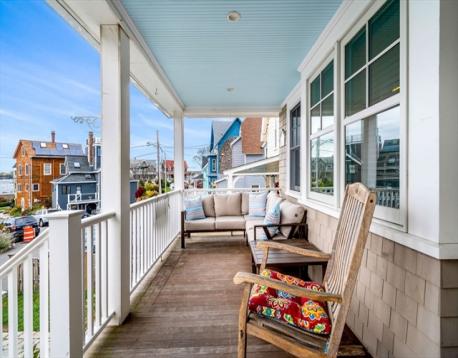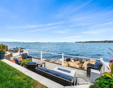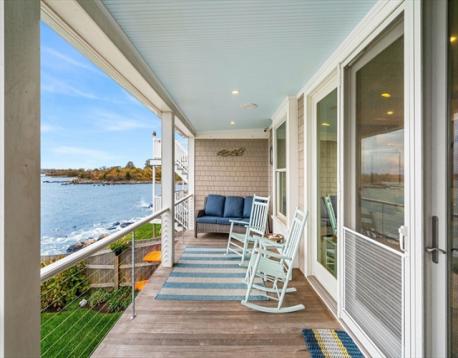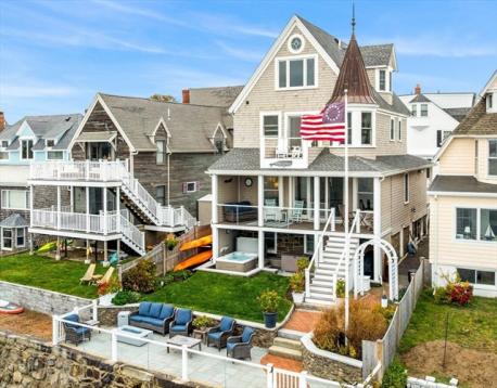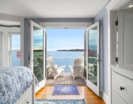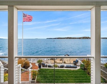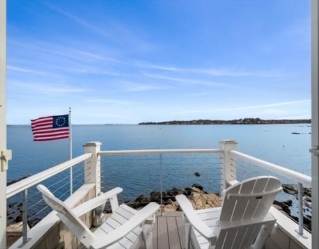 Rare opportunity to own a breathtaking waterfront home in coveted Juniper Point, fully renovated in 2018 with refined interior finishes and water views throughout. Wake to the sound of waves and savor your morning coffee on a private ocean-view balcony off the primary suite. The open-concept main level features a chef's kitchen, large dining area, and open living room with fireplace that opens to a back porch, lush yard, and waterfront patio with hot tub—ideal for entertaining. The 2nd floor offers a serene primary suite with ensuite bath and balcony, guest bedroom, guest bath, and large laundry room. Two additional bedrooms and a half bath occupy the 3rd floor, plus a finished basement with custom built-ins and storage/workshop space. Enjoy sunsets and friendly hellos from the charming front porch. Neighborhood amenities include a sandy beach, playground, and Salem Willows. This home includes an opportunity for nearby mooring.