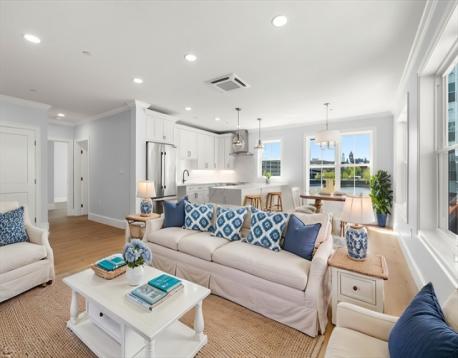 RIVERWALK presents a refined collection of luxury single-level boutique condominiums on the North Shore, designed for effortless, elevated living. Ideally located with easy access to the train to Boston and the acclaimed dining, shopping, and culture of downtown Salem, it offers the perfect balance of connection and retreat.This beautifully appointed three-bedroom, two-bath residence features single-level living with oversized windows, high ceilings, and water and skyline views. The chef’s kitchen includes Bosch appliances, custom cabinetry, and quartz countertops, opening to spacious living and dining areas with European hardwood floors.The primary suite includes a walk-in closet and spa-like bath with heated floors, double vanity, glass shower, and smart bidet. Development amenities include heated garage parking, elevator, Clubroom Lounge, fitness center, and riverside outdoor patio.