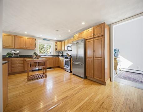 2 Sunset Road is a beautifully maintained colonial home featuring 3 bedrooms and 2 full bathrooms. The home is located in a peaceful neighborhood with close proximity to Salem Harbor and Marblehead Rail Trail. This property features neighborhood beach rights, updated central AC mini-split system (2018), a new roof in 2020, and finished basement. The interior has hardwood flooring throughout, a living room with a fireplace, and an updated kitchen and dining area featuring a separate beverage area and granite countertops. Practical spaces include a mudroom, generous storage throughout, and a flexible bonus room—ideal for a home office or hobby space. Outside, the professionally landscaped yard features a spacious patio and a rear gate provides direct access to nearby nature trails.