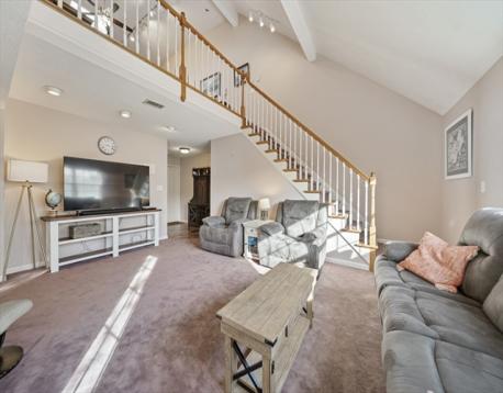 Picturesque living at The Village at Vinnin Square. Enter this spacious top level 3 bedroom, 3 bathroom, condo in a well-maintained luxury low rise building with a private garage. This unit features a large open concept living room with high ceilings and lots of natural light, opening to the dining room and kitchen with updated appliances and pantry closet. First floor primary suite with a large walk-in closet and en suite bath with tub/shower and walk in shower stall. Another bedroom, full bathroom and laundry closet finishes off this level. On the second level there is an expansive family/game room with cathedral ceilings, fireplace and large storage closet. Another primary suite with full bathroom, walk in close and access to large attic storage. Desirable community featuring resort style amenities including a pool, tennis courts, clubhouse and professionally maintained grounds. Best of both worlds, single family privacy with the perks of condo living!
