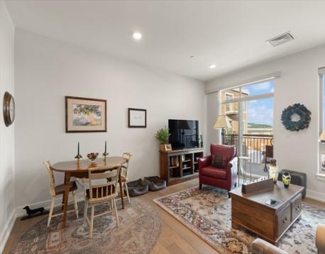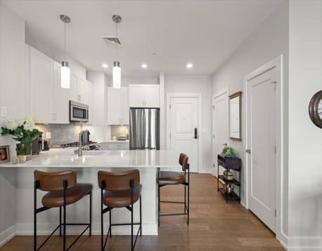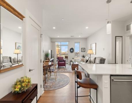 Situated at 65 Washington St. in Salem, this condominium presents an attractive property in great condition. Constructed in 2020, the residence offers a contemporary living experience on the fifth floor. The thoughtfully designed open floor plan creates an expansive atmosphere, perfect for both everyday living and entertaining. Within this engaging space, the kitchen stands as a centerpiece, featuring elegant stone countertops, a stylish backsplash, and pristine shaker cabinets, complemented by a functional kitchen peninsula and a convenient kitchen bar for relaxed dining. The kitchen opens into the living room with views of Salem as well as access to an outside balcony. As you continue into the unit you will find a lovely main bedroom with customized walk-in closet. There's also a half bath and a full bath with double sink, linen closet, and step-in shower. Stackable washer and dryer in the unit, Parking for one car in the enclosed lower-level garage.