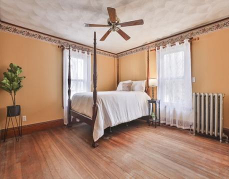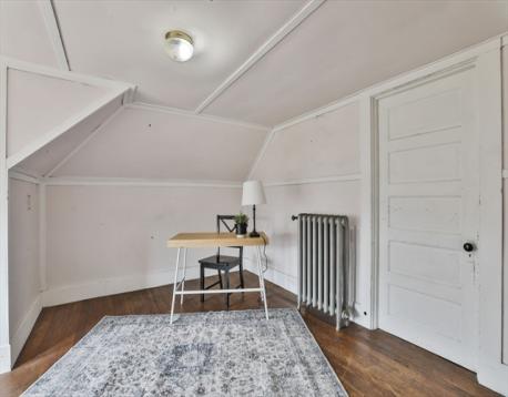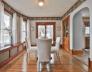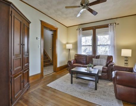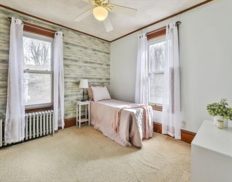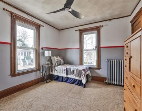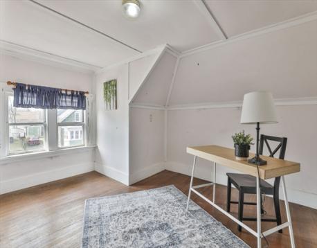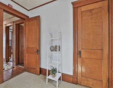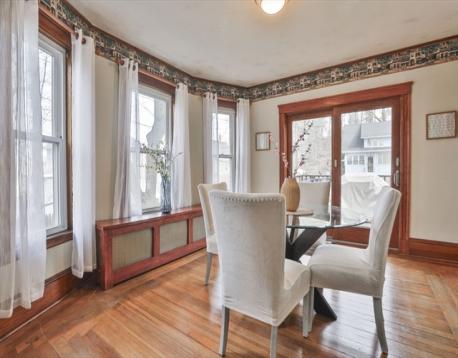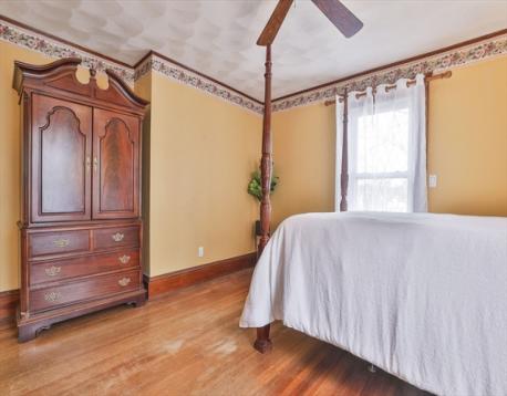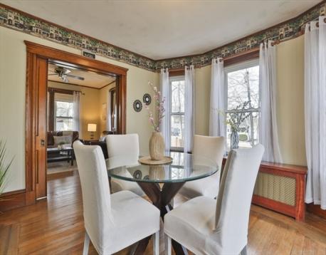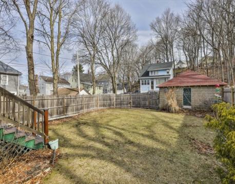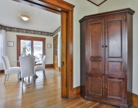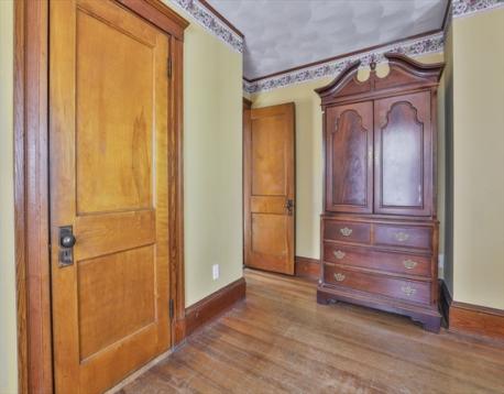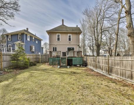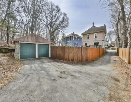 Welcome home to this solid 3+ bedroom, 1 bath colonial with large rooms and beautiful period detail and hardwood flooring throughout. The front foyer is warm and welcoming as you step through the front door off of the charming farmer's porch featuring a porch swing. The spacious kitchen offers plenty of cabinets with loads of counter space including a peninsula for eating at and two closets for storage, one being cedar. Off the kitchen is the formal dining room with built-in china cabinet, bow window and slider to large Trex deck and fenced yard. Open or close the pocket doors which lead to the living room and back to the foyer which also has a cedar closet. The 2nd floor offers 3 spacious bedrooms, a full tile bath, and access to the walk-up 3rd floor. 3rd floor is perfect for home office or play area or could be made into a bedroom as well. Plenty of storage in the back of the attic and full basement. Young heat & hot water, 200AMP electrical panel. Detached 2 car garage too!