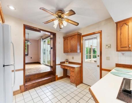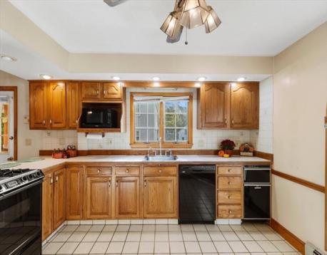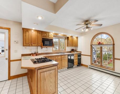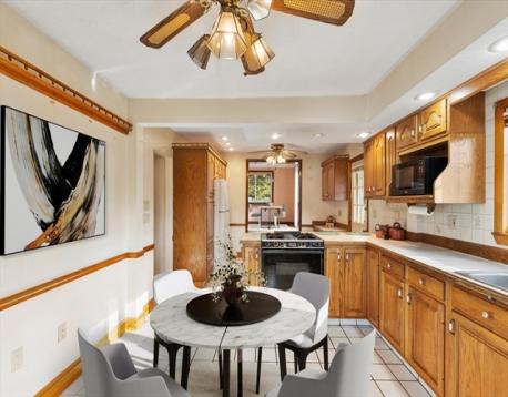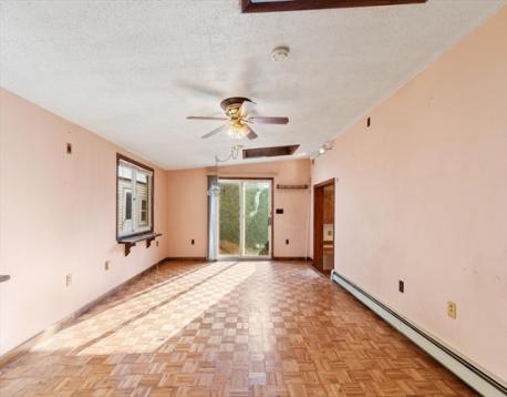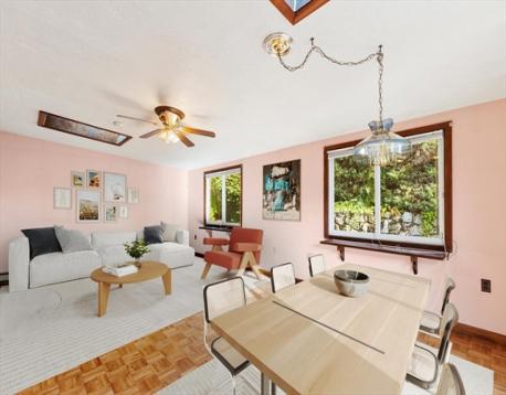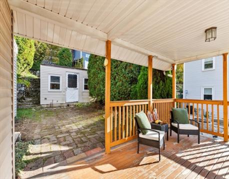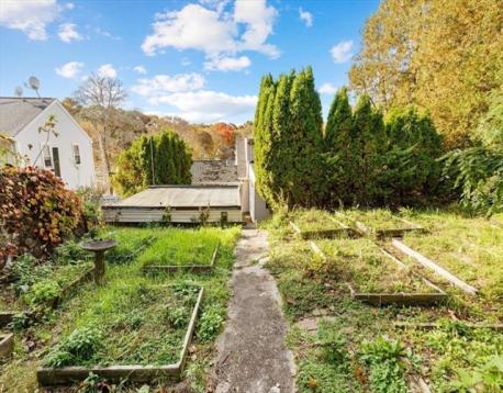 This 3-bedroom, 1.5-bath home on a double lot, offers an excellent opportunity to build equity and make it your own. The main level features a spacious LR and DR combination with parquet floors, oversized windows, two skylights, and a slider to the outside. The large eat-in kitchen includes a floor-to-ceiling window, a breakfast peninsula, a separate work area, and dual ceiling fans. The main-level primary bedroom has a double closet, while the two upper bedrooms each have built-ins and skylights. The finished lower level includes a front to back family room and a half bath—perfect for entertaining or relaxing. Outside, a covered deck extends the living space and overlooks a unique three-tiered yard: the first level has a shed, a patio and a covered deck, the second has flower and vegetable gardens, and the upper level has gated street access behind the property for additional parking. With solid bones and a versatile layout, this home is full of potential in a desirable location.