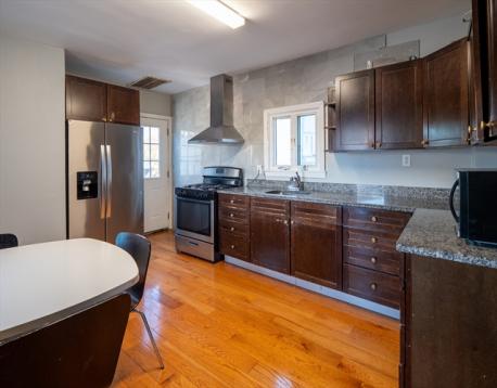 Positioned gracefully at 2 Hillside Ave in Somerville, MA, United States, this distinguished property presents itself as an inviting home, meticulously prepared for immediate occupancy. The culinary space within this residence is thoughtfully appointed, featuring elegant shaker cabinets that provide ample storage and a sophisticated backdrop to daily life. Culinary endeavors are elevated by the presence of gleaming stone countertops, offering both beauty and durability for meal preparation. A stylish backsplash adds a refined touch, complementing the overall design while protecting surfaces with grace. The inclusion of a high-end refrigerator ensures optimal food preservation, perfectly balancing advanced functionality with aesthetic appeal. Above the cooking area, a sleek wall chimney range hood stands ready to maintain a fresh atmosphere, efficiently clearing the air during gourmet experiences.