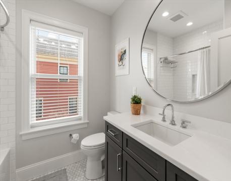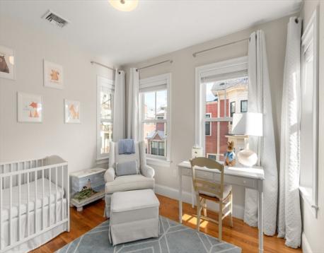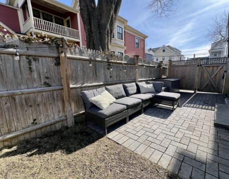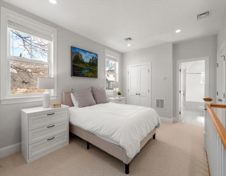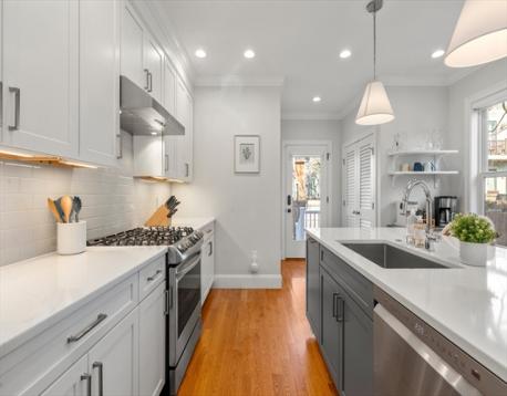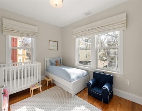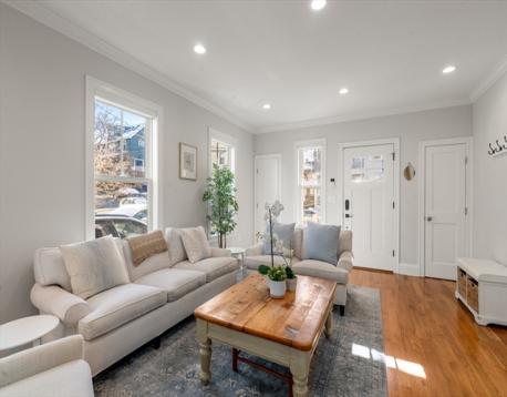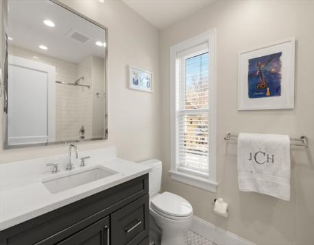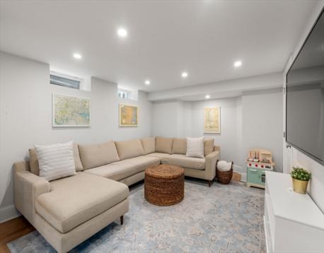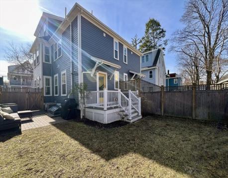 Located on a tree-lined street in sought-after Davis Square, this sophisticated contemporary home offers soaring ceilings and grandly scaled living spaces throughout. A 19' living room flows seamlessly into an the airy dining area with a box window. The gourmet kitchen is beautifully appointed with a large island, quartz countertops, tile backsplash, stainless steel appliances, and gas cooking, opening to a deck overlooking the private fenced-in yard and patio. The second level features a serene primary suite with walk-in closet, along with two additional bedrooms and a full bath. The top floor offers a spacious second primary suite, ideal for guests. The finished lower level includes a family/media room, exercise area, bedroom, and full bath with a walk-in glass enclosed shower. Ideally located just moments from Davis Station, as well as premier dining, shopping, and local amenities.