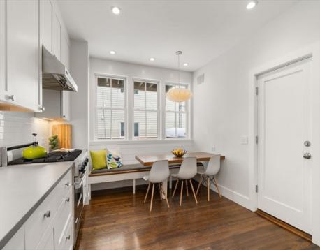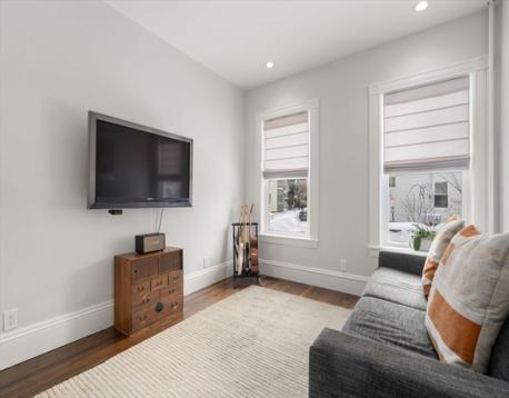 Located between Porter & Davis Squares, moments to the Red & Green MBTA lines and the Minuteman Bike Path, this 2019 new renovation condominium is thoughtfully executed with classic details and clean lines. Architect designed with quality finishes throughout and a flexible floorplan, the residences offers a light filled living room which opens to a showpiece chef’s kitchen featuring a Viking gas range, modern cabinetry + countertops, shiplap details + a built-in dining nook that seats six. There are two generous bedrooms plus a versatile 3rd room which is ideal for a home office, den or 3rd bedroom. The modern updated bath includes a tile shower surround & frameless glass shower doors. Additional highlights include central A/C, high ceilings, gleaming hardwood floors, basement storage and laundry. Enjoy morning coffee on your back deck, have a cook-out on the patio and enjoy stress free mornings with your car having its own garage spot.