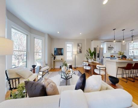 OPEN HOUSES Sat 3/28 and SUN 3/29- 12-2pm. Fall in love with this stunning Victorian style townhome with 4 bed and 3.5 bath on 3 living levels. Enjoy gleaming hardwoods and natural light throughout. First floor includes an open concept living/dining/kitchen, perfect for entertaining. The designer kitchen boasts quartz countertops, island and high-end stainless appliances. A 1/2 bath completes this floor. The second floor has 2 generous sized bedrooms with ensuite bathrooms and laundry. The top floor provides another 2 bedrooms and full bath. Plenty of storage in the unfinished basement. 2019 renovation included new systems, electric, plumbing, roof, windows as well as cement board siding. 2026 fresh paint throughout and new dishwasher. This unit comes with one deeded parking space. Fabulous location close to Inman, Harvard and Union Sq- Walker’s Paradise (94) and Biker’s Paradise (100)