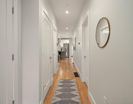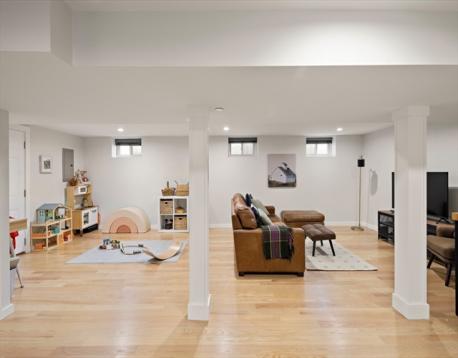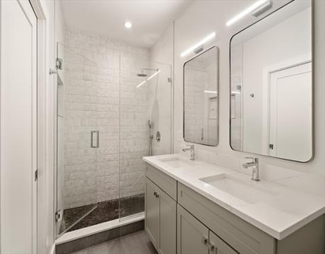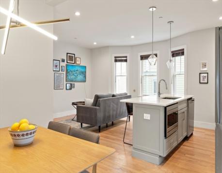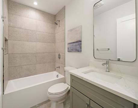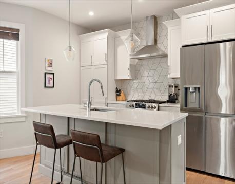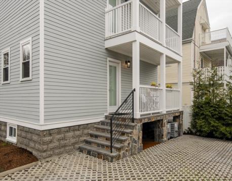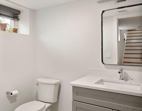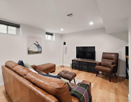 This modern 2-bedroom, 2.5-bath condominium was fully renovated in 2022 and offers 1,801 square feet of thoughtfully designed space across two levels, including a fully finished basement. The main level features an open living and dining area and a chef's kitchen with shaker-style soft-close cabinets and drawers, quartz countertops, a center island, stainless steel appliances, and a tiled backsplash. The primary en-suite and guest bath are finished with high-end tile and fixtures. The lower level offers flexible space ideal for a family room, office, gym, or playroom, along with laundry, storage, and a half bath. Central air throughout. Outside, there's a private rear stone deck and one deeded parking space.