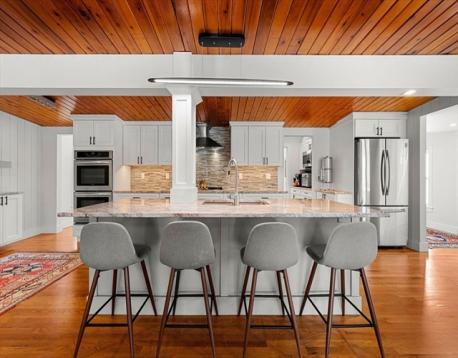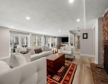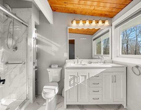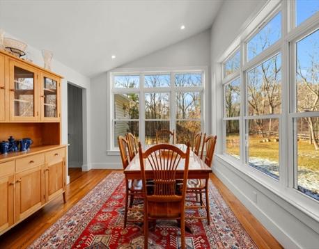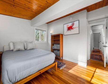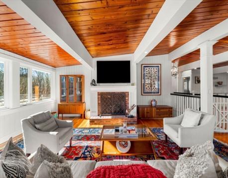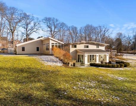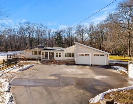 Stunning, move-in-ready mid-century modern home set on over four private acres in a sought-after Estate location. Renovated in 2021 with multiple additional recent improvements, this exceptional property offers the ease of single-level living with the primary suite and two additional bedrooms on the main floor. The open-concept layout features a chef’s eat-in kitchen flowing seamlessly into a fireplaced living area, while a separate dining space showcases walls of windows that flood the home with natural light. The finished lower level offers an expansive family room with sliders leading to a brand-new sunroom addition overlooking the bucolic grounds. A fourth bedroom with an oversized walk-in closet, spacious laundry room, and dedicated home office complete this level. Approximately three acres are fully fenced and complemented by an irrigation system, whole-house generator, hot tub, and a garden with peach trees. A special property offering privacy, style, and modern comfort.