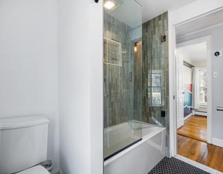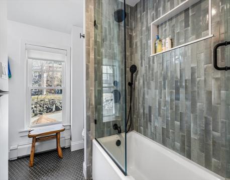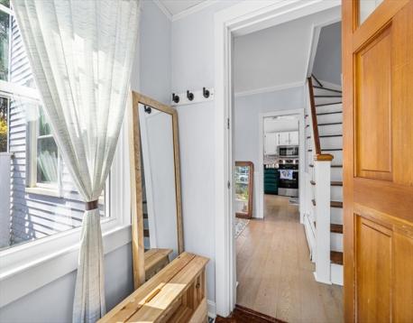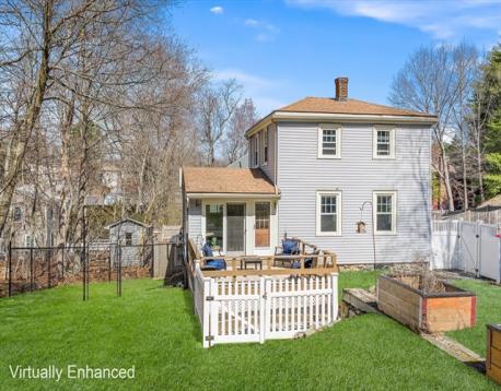 Nestled on a quiet Greenwood side street in a sought-after neighborhood, this updated 3-bedroom Colonial offers a perfect blend of comfort and style. The sunny living room features crown molding and hardwood floors, flowing into a formal dining room ideal for gatherings. The updated kitchen boasts stainless steel appliances, painted cabinets, and easy access to a full-length bonus family room with a mini split system and a convenient half bath. Sliders lead to a spacious deck overlooking a private backyard oasis with a mix of sun and shade, a firepit area, a large grassy yard, garden space, and a dedicated dog pen. Upstairs, enjoy a renovated 2023 bathroom with stylish tile, a deep tub with glass doors, and built-in storage. Major updates include furnace, oil tank, hot water heater, and 200 amp electric (2022), plus new windows (2024). Minutes to dining, parks, commuter rail, and bus service.