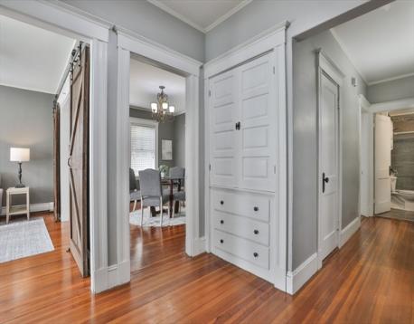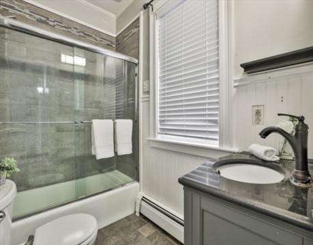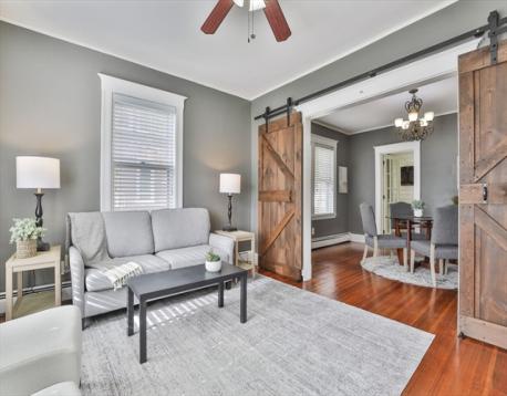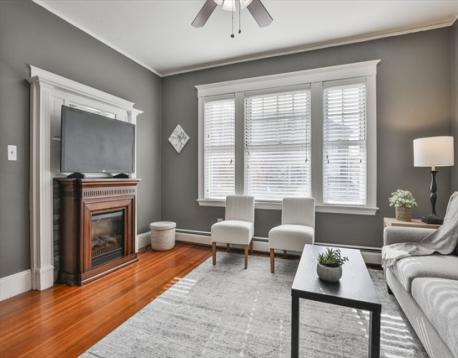 Very well laid out and spacious sun splashed 2 bedroom condo with formal dining room and living room, IN UNIT LAUNDRY, GAS cooking & heat, young boiler and parking for 2 cars. 100% owner occupied well maintained building. Beautifully updated with modern features such as a tasteful kitchen and bath as well as barn doors while maintaining the charm of yesteryear including built ins, high ceilings, an antique mantel, gorgeous moldings and gleaming hardwood floors. Excellent storage in the unit itself as well as a shockingly huge storage space in the basement. The location is phenomenal! Just 2 doors down from the Beebe Library, around the corner from the Post office, 2 blocks from commuter rail/bus, 3 blocks from Lake Quannapowitt where there is a park, boating and a seasonal Farmers Market. Great shopping and restaurants within a few blocks in all directions.