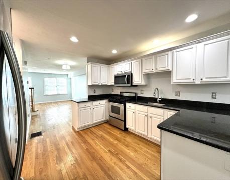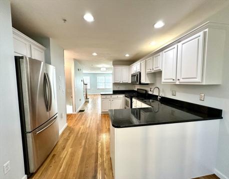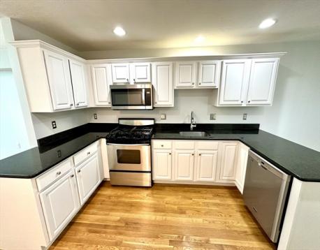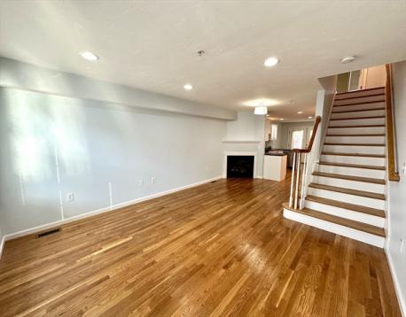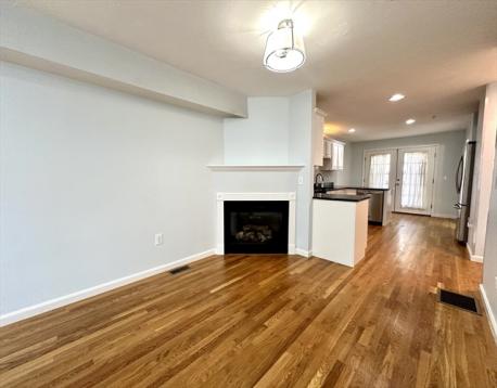 Welcome to 47 Alder St in the desirable downtown FIELDSTONE CROSSING location. This well maintained 2 bed 1.5 bath townhouse condo is ready for you. Street level offers heated GARAGE PARKING for 2 cars w/ direct entry into the condo. Spanning 1,248SF, this beautiful residence combines modern comfort & convenience. The main living level offers a fantastic, fully applianced, freshly painted GRANITE & STAINLESS kitchen w/ an open concept, breakfast bar, dining area & the sun lit living room w/ GAS FIREPLACE. A half bath & French doors to a private balcony finish off this level. 3rd floor level offers both bedrms & the full bath. Guest bedrm w/ private balcony. Primary bedrm has cathedral ceiling & an arched window offers ample sunlight w/ a bonus loft space w/ new SKYLIGHT that is ideal for a home office. In recent years updates include siding, furnace, AC condeser, lighting, appliances. Close to C-RAIL & MBTA station, all Moody St amenities, shops, restaurants, Charles River & more.