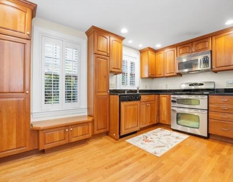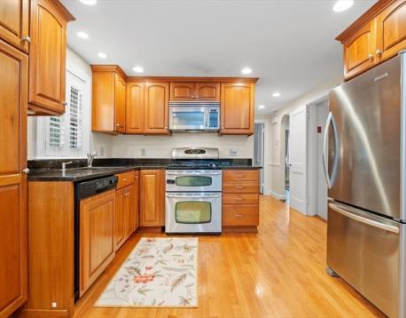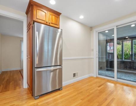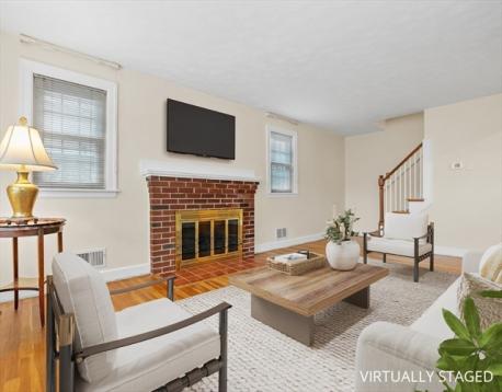 Sought-after West Side Watertown! This charming renovated Cape/Bungalow offers a perfect blend of character and modern updates. The bright fireplaced living room welcomes you with warmth and gleaming hardwood floors. Enjoy a newer cherry kitchen with granite countertops, stainless steel appliances, and recessed lighting, along with sliders leading to a sunny rear den with a bay window—ideal for relaxing or entertaining. The newer designer tile bath adds a touch of elegance, while the skylit primary bedroom with a walk-in closet provides a comfortable retreat. The finished basement features a spacious family room with a wet bar and tiled half bath, great for gatherings or guests. Additional highlights include a 2020 heating system, 2009 windows, and a private fenced rear yard for outdoor enjoyment. Conveniently located near Watertown Square, parks, shops, and public transportation, this home combines timeless charm with thoughtful updates.