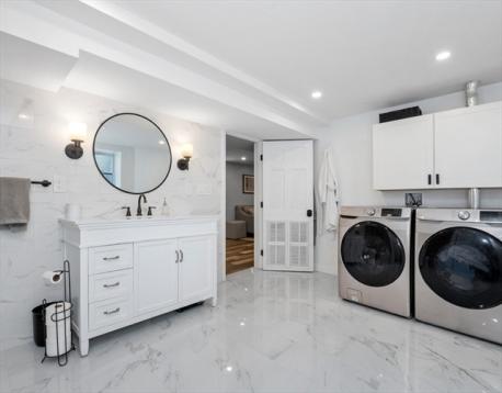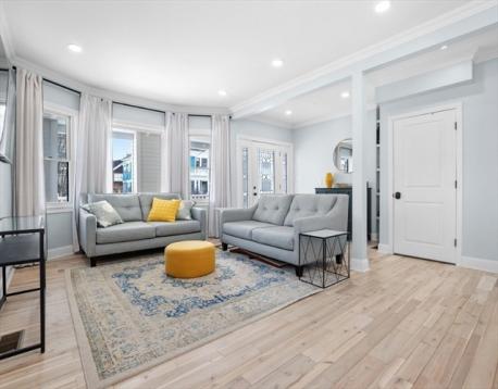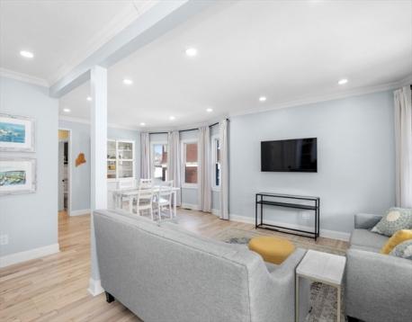 Beautifully renovated first-floor condo overlooking Oakley Country Club, this home offers top-quality finishes, a garage, and an unbeatable location near Cushing Square, public transportation, Route 2 and the Mass Pike. The bright open living and dining area features hardwood floors, crown molding, recessed lighting, and a bay window. The stunning white kitchen includes quartz counters, tile backsplash, high-end stainless-steel appliances, gas cooking, a farmer’s sink, a large island, and a coffered ceiling, with direct access to the rear porch and patio. The main level bedrooms offer unique touches and a beautifully updated bath with a quartz vanity and tub/shower. The fully finished lower level adds a spacious family room, generous bedroom, laundry, and a luxurious second bath with marble tile, a soaking tub, and a separate shower—perfect for guests or extended living.
