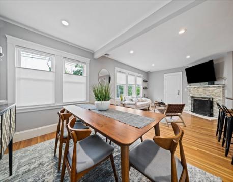 This exceptional four-bedroom home offers nearly 2,000 sq ft across two spacious levels, complete with garage parking. Converted and fully renovated in 2015, it features a thoughtfully designed open floor plan and is meticulously maintained. The kitchen boasts stainless steel appliances, gas cooking, granite countertops, maple cabinetry, and hardwood floors. It flows seamlessly into a sunny living room highlighted by a cozy fireplace and expansive south-facing windows. The main level offers three spacious bedrooms with hardwood floors and a full bathroom. Upstairs, the impressive primary suite includes a walk-in closet, an en-suite bathroom, and a versatile bonus room with custom built-ins that is absolutely perfect for a home office. Step outside to the serene back patio surrounded by beautifully landscaped gardens. Extra private storage space is conveniently located in the basement. Located across from Hosmer Elementary School, this home blends style, comfort, and location.