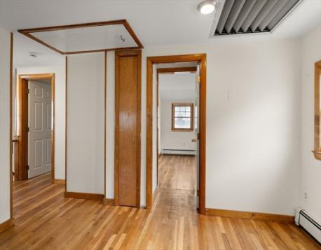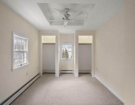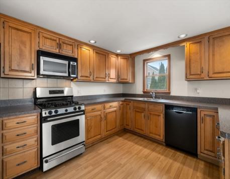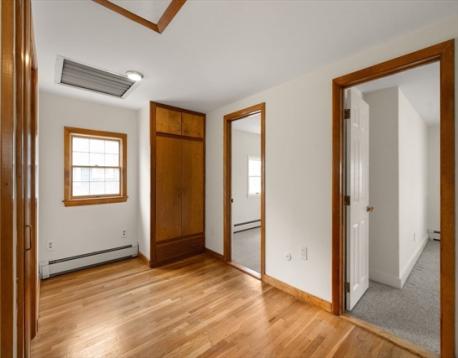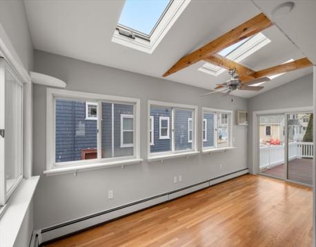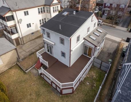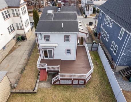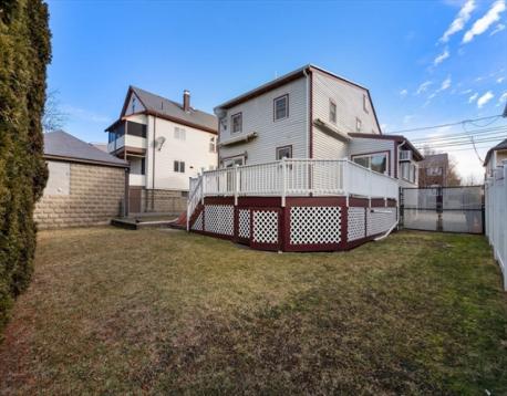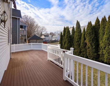 Sunny 4 bedroom, 1.5 bath Colonial, featuring an open flow first floor with fireplaced living room, glowing sun room area with lots of windows, sky lights, beamed cathedral ceiling, and spacious eat-in-kitchen with laundry. Double sliders from the kitchen and sunroom lead to an impressive wrap around rear deck, built for entertaining. The deck steps down to a beautiful, fully fenced in private yard, ideal for the pet lover, gardener, or growing family. Conveniently located, a short walk to Cunniff Elementary and Bemis Park playground. First Open House Saturday Jan 17 12-2 and Sunday Jan 18 11:30-1.