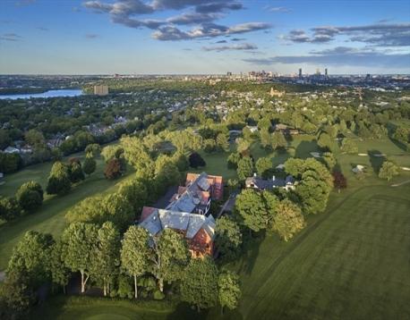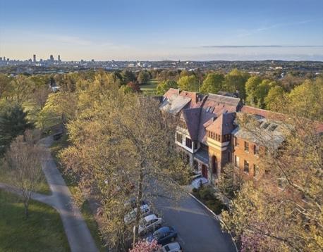 Payson Estate. Top-floor 2 bedroom, 2.5 bathroom condominium with panoramic Boston skyline views in Elevator-Building. Professionally-designed and gut-renovated, this corner unit merges Tudor Architecture with a modern minimalist interior. Bright and airy throughout with 3-exposures, cathedral ceilings, skylights, wide plank flooring, new custom windows & doors by Kolbe and Kolbe, kitchen cabinets by Nobilia of Germany & stainless steel appliances by Miele & Liebherr. Spacious master bedroom suite features a walk-in shower, radiant floors and custom wardrobe by Fimes of Italy. Other amenities include full-size in-unit laundry, new heating/air-conditioning, deeded parking along with guest parking. Spacious walk-in storage room for all your downsizing woes. Easy walk to cafes & shops in Cushing Square with public transport to Cambridge. South-facing pool for summer get-togethers. A tranquil and unique setting.