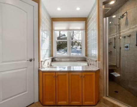 Stylish and inviting this beautifully updated home is filled with abundant natural light and offers a flexible floor plan and exceptional space. Generous living room and formal dining room flow into expansive eat in kitchen opening to family room with exposed beams, impressive ceiling height and wood burning fireplace. Walls of windows overlook large level landscaped lot with doors opening to beautiful stone patio making this home perfect for indoor /outdoor entertaining. Lovely primary suite includes luxurious bath with radiant heat, three additional family bedrooms and a newly renovated hall bath. Private home office on the second floor, lower level includes spacious playroom, exercise space, cedar closet and an ample amount of storage. Attention to detail and many recent upgrades including 200 amp service, HVAC replacement, new water heater, exterior paint and an EV charger. Move in ready and close to town, train and schools.