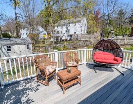 Traditional and charming New England cape with fabulaous curb appeal. Be ready to move right in! The gray shingle siding, classic black shutters, dormers, and charming brick entry walkway lead to a warm and welcoming interior, designed for easy one-level living. The first floor offers exceptional flexibility, with a primary bedroom suite, an updated kitchen with a dining area, a family room with gas fireplace, living room, a powder room, and a laundry room — everything you need on a single level. Step outside to two distinct outdoor living spaces — an inviting rear deck off the kitchen with two private ground-level patio areas — both overlooking a peaceful backyard perfect for entertaining and relaxation. The attached garage, mature landscaping, and roofline expansion round out a property that is as functional as it is charming.