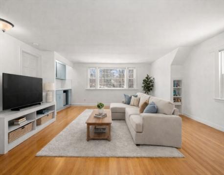 Expanded 3 bedroom Cape in Wellesley Hills! Great flexibility in this floorplan. First floor with oversized living room with fireplace opens to dining room with built-in china cabinet. Kitchen with great counter space and pantry closet. Sunroom overlooking the over 13,400 sq ft yard. 2 additional bedrooms and full bath complete the first floor. The second floor with large main bedroom and full bath plus huge bonus family room with wet bar and bookcases. This family room can also easily be made into 2 additional bedrooms. Lower level with finished playroom and additional 22 x 13 unfinished space off of garage that is perfect for future exercise room. Large laundry area. This home has the ability to move right in or put your own personal touches. Enjoy the easy access to Wellesley Hills shopping, train, town recreation center and routes to Boston! A must see!